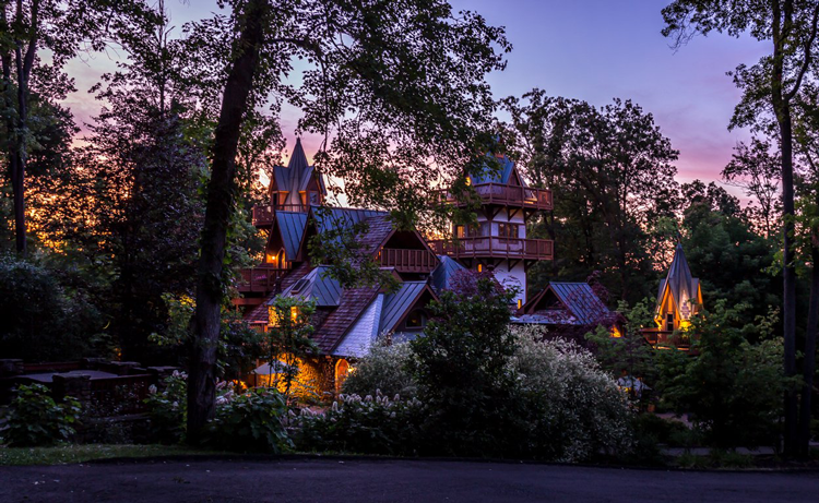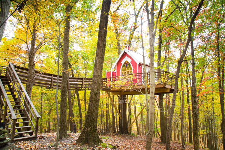 Little Red is one of the newer houses, and was designed for adventurous couples. Crafted by renowned treehouse designer, Pete Delson, it was initially created as a brewery and tasting center for Tree House Brewing Company Beer, but has since been converted into a romantic getaway complete with stained glass windows and a lofted bed.