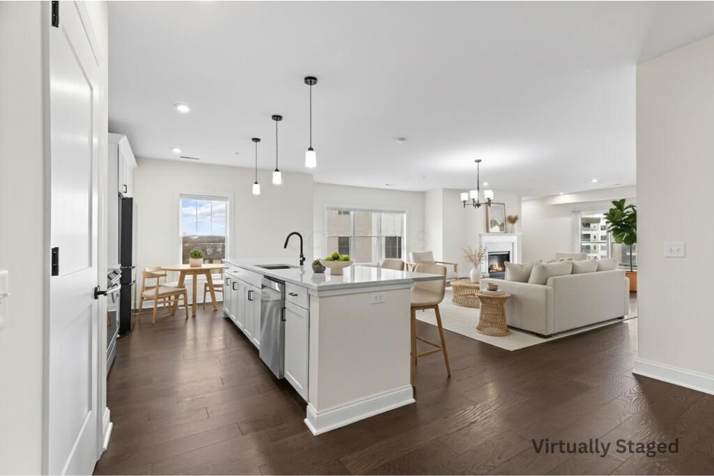 EXCEPTIONAL VALUE for this IMMACULATE home! Golf course now open! 3rd level corner unit SOUTH WEST facing for an abundance of natural light! Experience ultimate privacy and elevated living in this stunning third floor end unit at Highpointe, ideally positioned with generous spacing between buildings and sweeping views of the golf course, pool, and even the downtown skyline. Premium upgrade package shines throughout this light-filled home, offering a wide open floor plan, 9 foot ceilings, oversized windows, and expansive sliding doors that fully open to a private balcony, perfect for enjoying beautiful sunsets. Chef's kitchen anchors the home and flows seamlessly into the great room w/ fireplace and dining area. Features include quartz countertops, stainless steel appliances, a massive island, large walk in pantry, and hardwood floors throughout (including under carpet). This thoughtfully designed residence offers three bedrooms, two and a half baths, including a spacious primary suite with a luxurious en suite bath and a den area. Two designated below grade garage spaces are included within this secured access building. Golf club offers a pool & golf simulator! Minutes from the freeway, Easton, airport and downtown Columbus. This home delivers privacy, style, and convenience in one exceptional package.